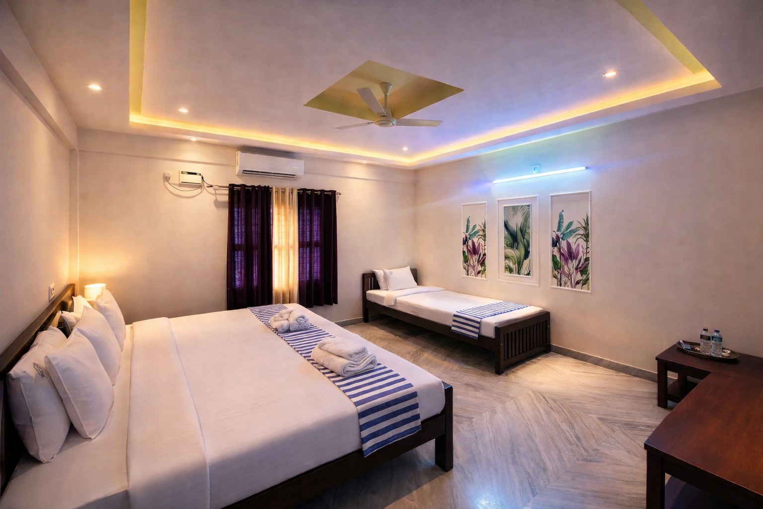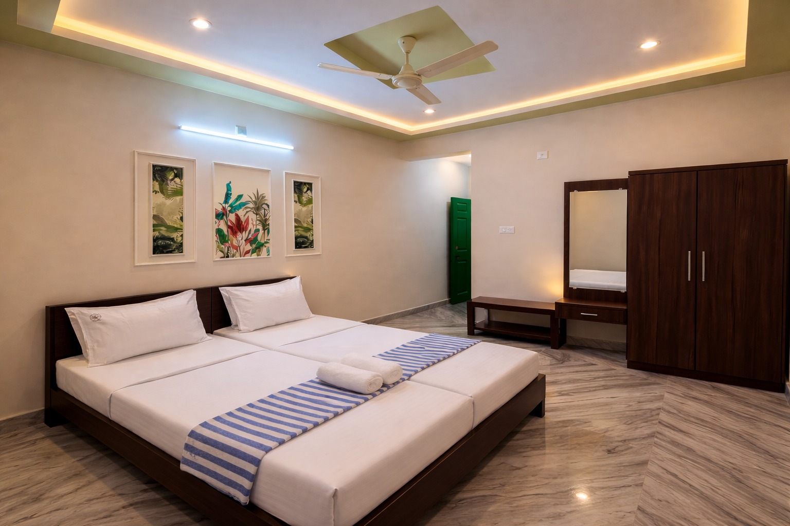 Spacious and welcoming, our Quad Room is perfect for family or groups of four. Enjoy a comfortable, homely stay together near Dharmasthala. Ideal for staying together with ease and comfort.
